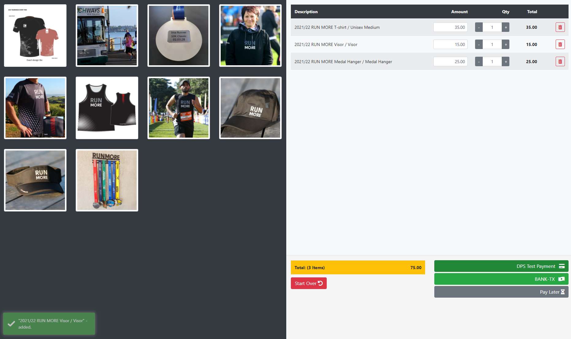 Event staff can quickly record any merchandise selections on the screen by clicking on product photos and selecting options (e.g. tshirt size) from the pop up. A running tally of the items in the “cart” are shown on the right side of the screen alongside the total payment due and available payment methods. The system is designed to record anonymous sales in a fast and efficient manner – but the confirmation screen also allows the sale to be optionally sent to an email address or attached – via quick race number lookup – to a registration from that particular event.